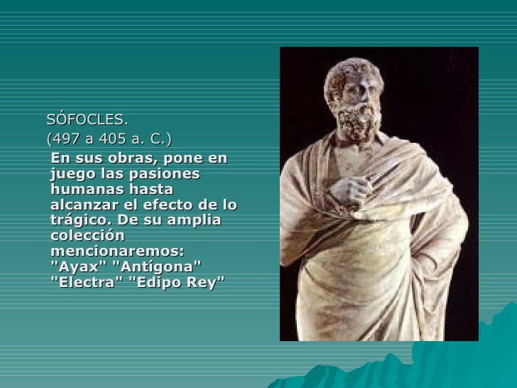 Aparece ante nuestros ojos la figura emblemática de la tragedia creación del dramaturgo de todos los tiempos, Sófocles, un poeta feliz quien incursionó en los ámbitos de la tragedia humana.